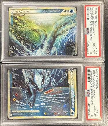 This 2010 Pokémon HeartGold & SoulSilver Lugia Legend set features both cards #113 and #114 in stunning holographic detail, graded PSA 8 for excellent condition. As a paired collection, it captures the iconic legendary Pokémon Lugia, highly sought after by collectors and enthusiasts. This set combines rarity, quality, and nostalgia, making it a valuable addition to any serious Pokémon card portfolio.