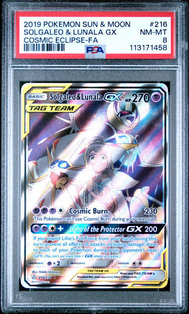 2019 Pokemon Sun & Moon Cosmic Eclipse #216 Solgaleo & Lunala Gx PSA 8
