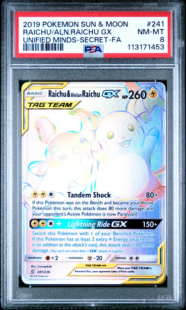 2019 Pokemon Sun & Moon Unified Minds #241 Raichu Alolan Raichu Gx PSA 8