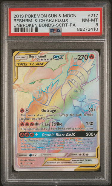 2019 Pokemon Unbroken Bonds #217 Reshiram & Charizard Gx PSA 8