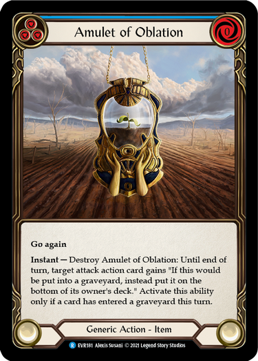 Instant - Destroy Amulet of Oblation: Until end of turn, target attack action card gains "If this would be put into a graveyard, instead put it on the bottom of its owner's deck." Activate this ability only if a card has entered a graveyard this turn.