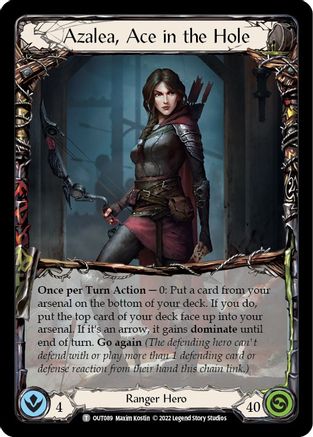 Once per Turn Action — 0: Put a card from your arsenal on the bottom of your deck. If you do, put the top card of your deck face up into your arsenal. If it's an arrow, it gains dominate until end of turn. Go again (The defending hero can't defend with or play more than 1 defending card or defense reaction from their hand this chain link.)