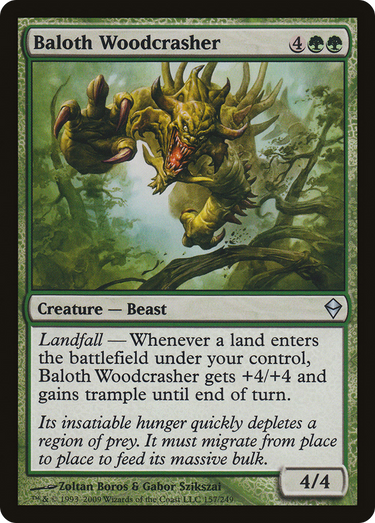 Landfall — Whenever a land you control enters, this creature gets +4/+4 and gains trample until end of turn. (It can deal excess combat damage to the player or planeswalker it's attacking.)