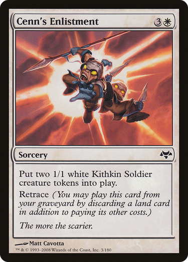 Create two 1/1 white Kithkin Soldier creature tokens. Retrace (You may cast this card from your graveyard by discarding a land card in addition to paying its other costs.)