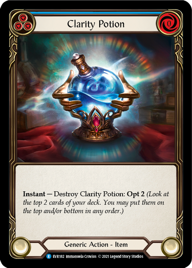 Instant - Destroy Clarity Potion: Opt 2. (Look at the top 2 cards of your deck. You may put them on the top and/or bottom in any order.)