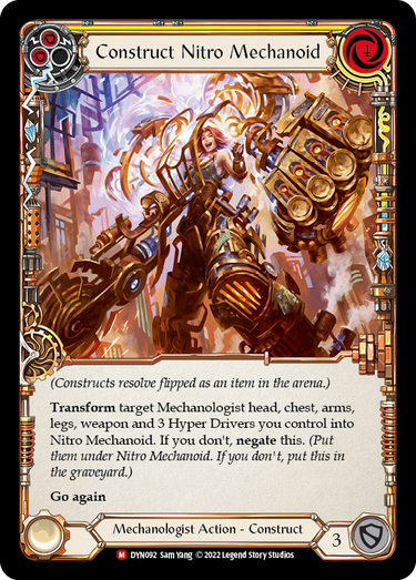 Transform target Mechanologist head, chest, arms, legs, weapon and 3 Hyper Drivers you control into Nitro Mechanoid. If you don't, Negate this. (Put them under Nitro Mechanoid. If you don't, put this in the Graveyard.)