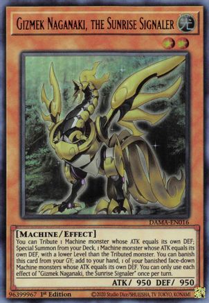 You can Tribute 1 Machine monster whose ATK equals its own DEF; Special Summon from your Deck, 1 Machine monster whose ATK equals its own DEF, with a lower Level than the Tributed monster. You can banish this card from your GY; add to your hand, 1 of your banished face-down Machine monsters whose ATK equals its own DEF. You can only use each effect of "Gizmek Naganaki, the Sunrise Signaler" once per turn.