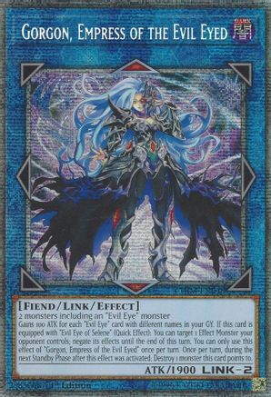 Gains 100 ATK for each "Evil Eye" card with different names in your GY. If this card is equipped with "Evil Eye of Selene" (Quick Effect): You can target 1 Effect Monster your opponent controls; negate its effects until the end of this turn. You can only use this effect of "Gorgon, Empress of the Evil Eyed" once per turn. Once per turn, during the next Standby Phase after this effect was activated: Destroy 1 monster this card points to.