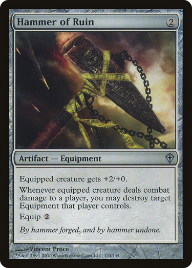 Whenever equipped creature deals combat damage to a player, you may destroy target Equipment that player controls.