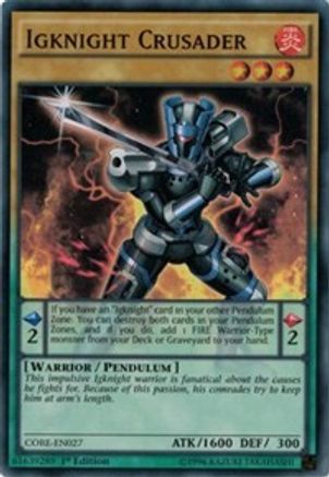 Pendulum Effect : If you have an "Igknight" card in your other Pendulum Zone: You can destroy both cards in your Pendulum Zones, and if you do, add 1 FIRE Warrior-Type monster from your Deck or Graveyard to your hand.