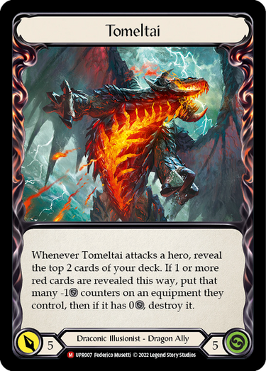 Whenever Tomeltai attacks a hero, reveal the top 2 cards of your deck. If 1 or more red cards are revealed this way, put that man -1ARMOR counters on an equipment they control, then if it has 0SHIELD, destroy it.