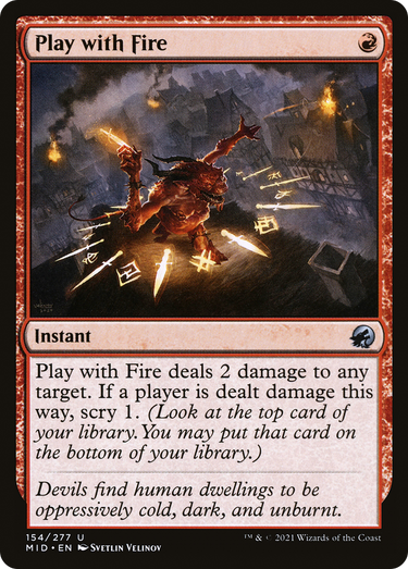 Play with Fire deals 2 damage to any target. If a player is dealt damage this way, scry 1. (Look at the top card of your library. You may put that card on the bottom of your library.)