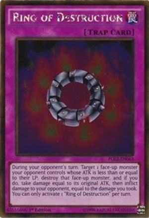 During your opponent's turn: Target 1 face-up monster your opponent controls whose ATK is less than or equal to their LP; destroy that face-up monster, and if you do, take damage equal to its original ATK, then inflict damage to your opponent, equal to the damage you took. You can only activate 1 “Ring of Destruction” per turn.
