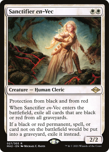When Sanctifier en-Vec enters the battlefield, exile all cards that are black or red from all graveyards.