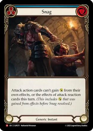 Attack action cards can't gain POWER from their own effects, or the effects of attack reaction cards this turn. (This includes POWER that was gained from effects before Snag resolved.)