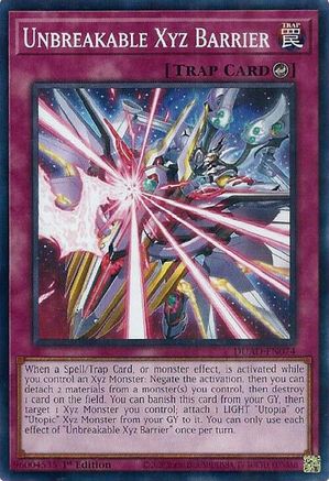 When a Spell/Trap Card, or monster effect, is activated while you control an Xyz Monster: Negate the activation, then you can detach 2 materials from a monster(s) you control, then destroy 1 card on the field. You can banish this card from your GY, then target 1 Xyz Monster you control; attach 1 LIGHT "Utopia" or "Utopic" Xyz Monster from your GY to it. You can only use each effect of "Unbreakable Xyz Barrier" once per turn.
