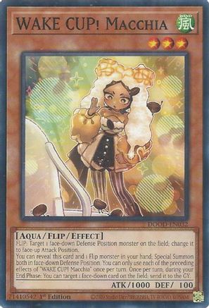 You can reveal this card and 1 Flip monster in your hand; Special Summon both in face-down Defense Position. You can only use each of the preceding effects of "WAKE CUP! Macchia" once per turn. Once per turn, during your End Phase: You can target 1 face-down card on the field; send it to the GY.