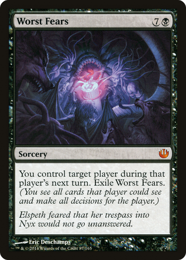 You control target player during that player's next turn. Exile Worst Fears. (You see all cards that player could see and make all decisions for the player.)